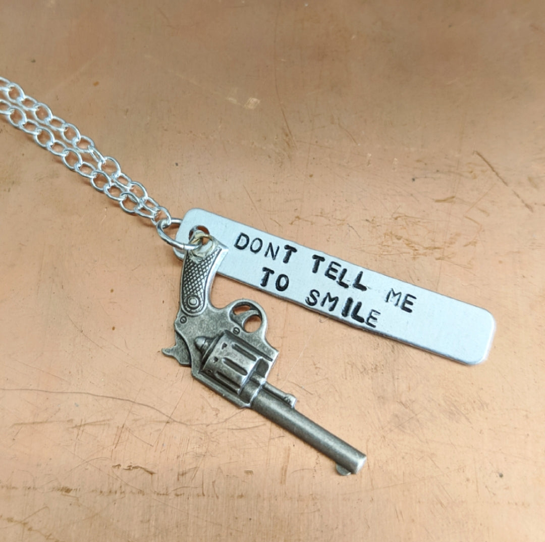 hand stamped aluminum pendant and a vintage brass pistol charm hanging from a sterling silver chain.