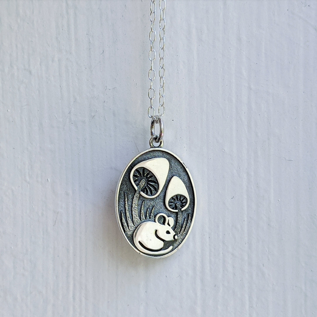 1" tall sterling silver pendant adorned with a sweet little mouse under mushrooms hanging from a sterling silver chain.
