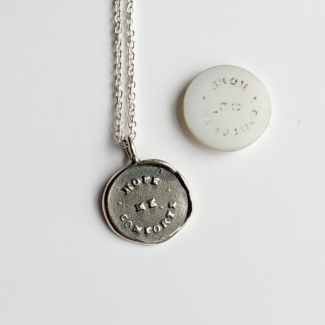 This 1/4" tall sterling silver charm is made from an antique wax seal that was hand carved in the 1800's. This charm reads "Hope Comforts Me" and it hangs from a sterling silver chain.