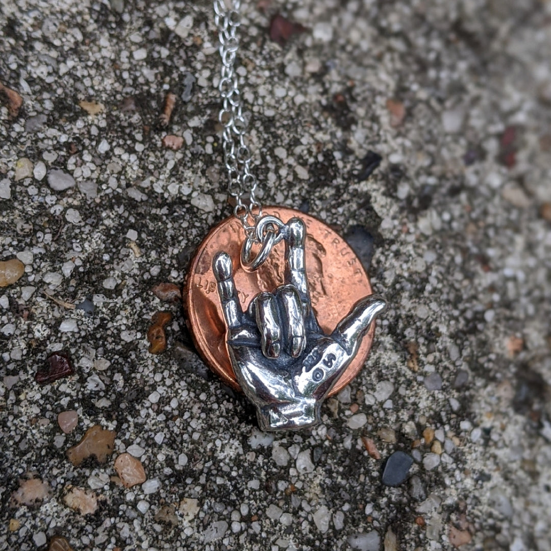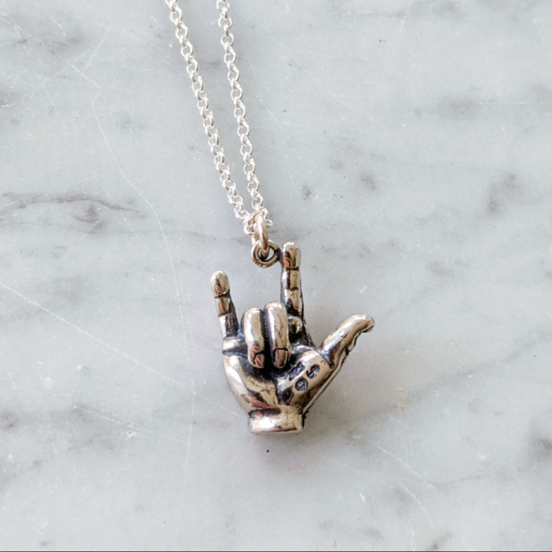 Sterling silver hand signing "I Love You" hanging from a sterling silver chain.