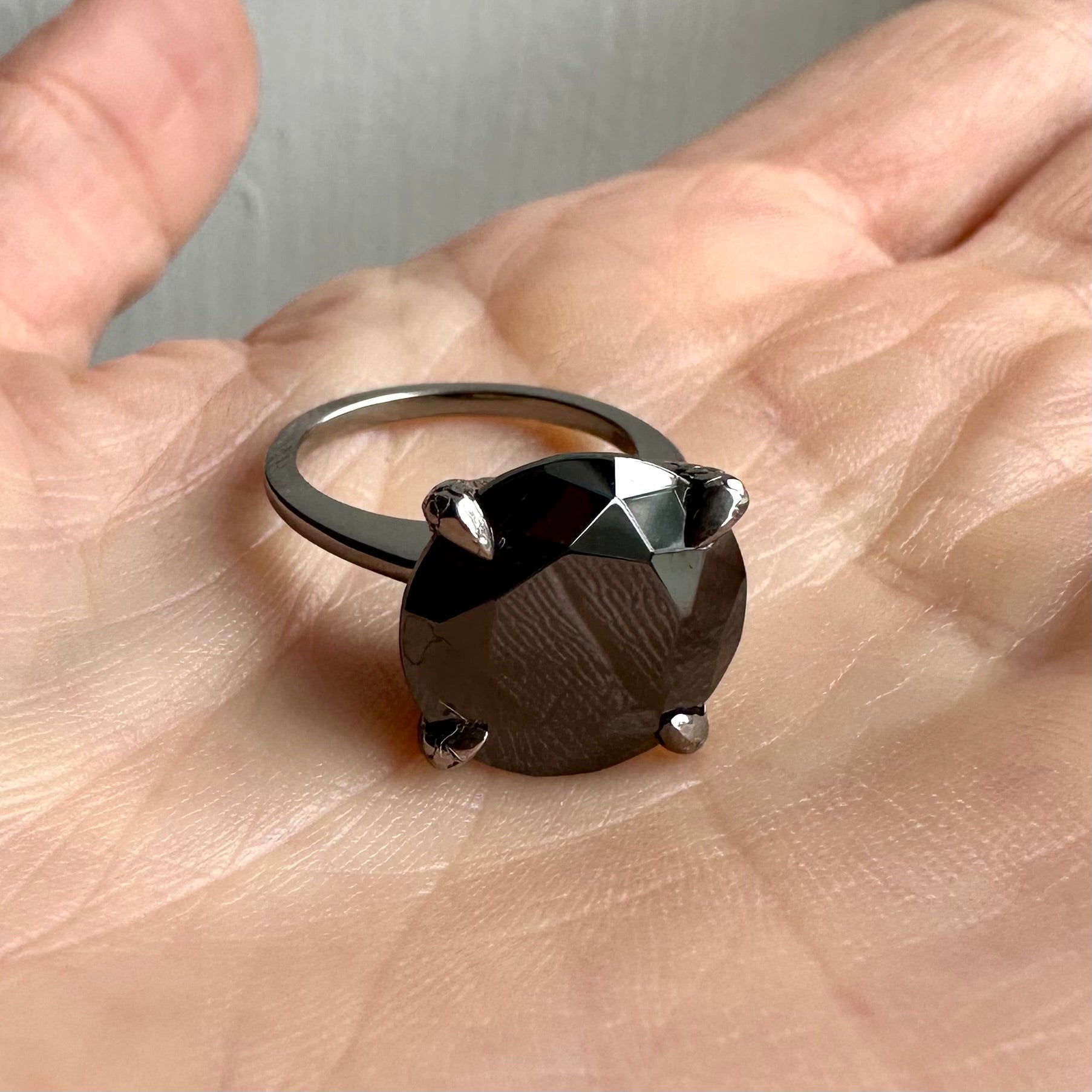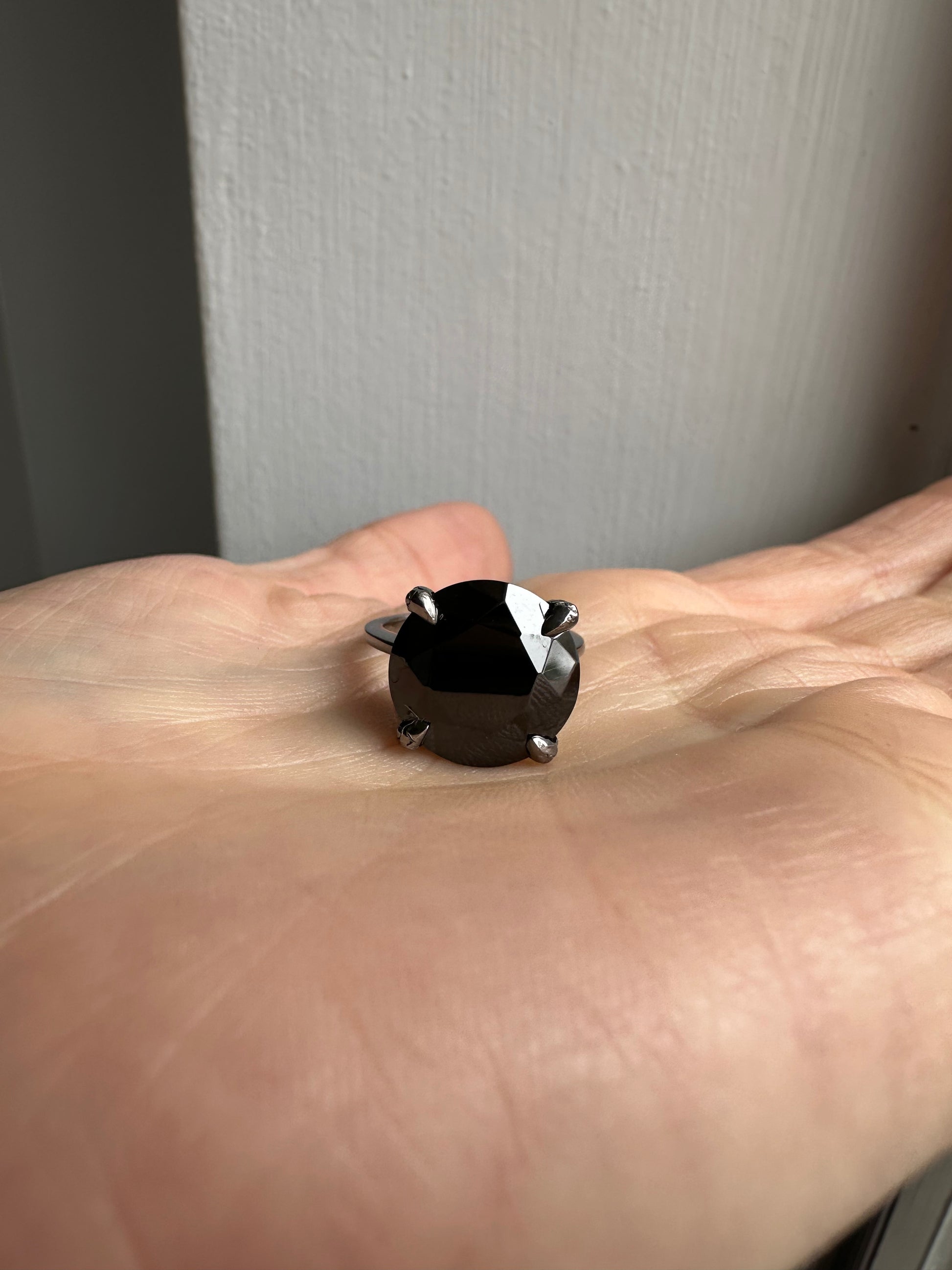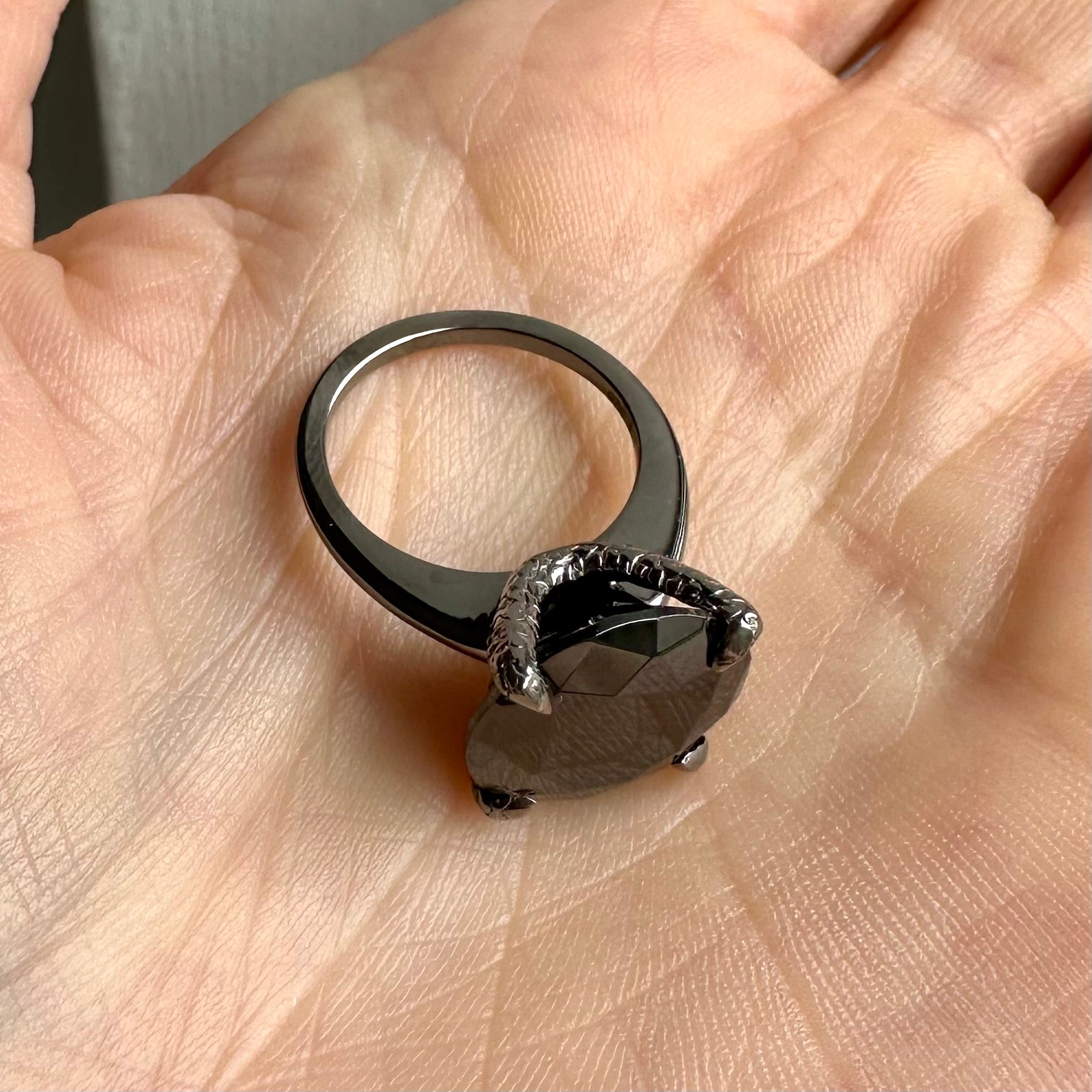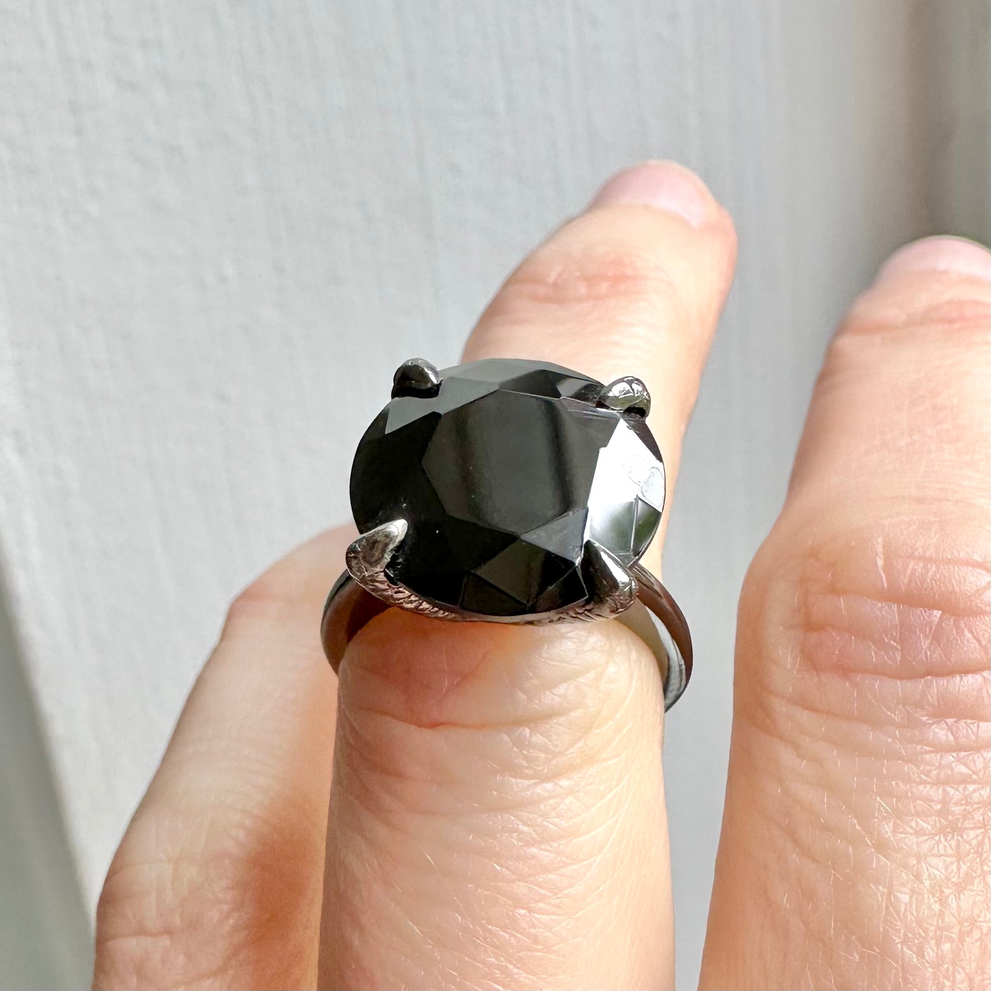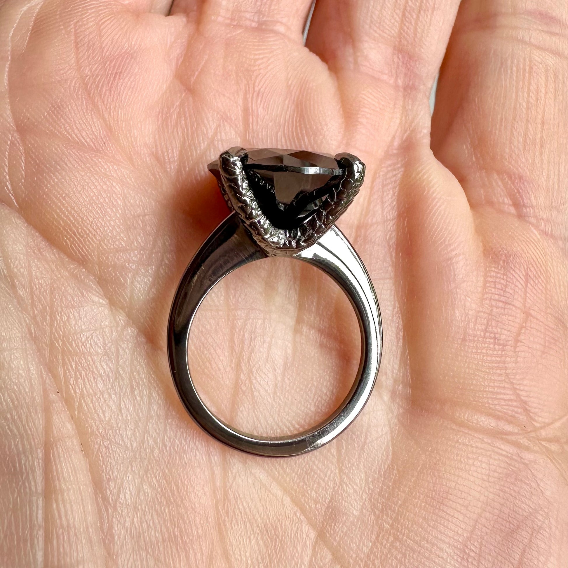 A Leviticus Jewelry original ring design. A unique and beautifully cast talon setting holding a breathtaking large black faceted crystal.