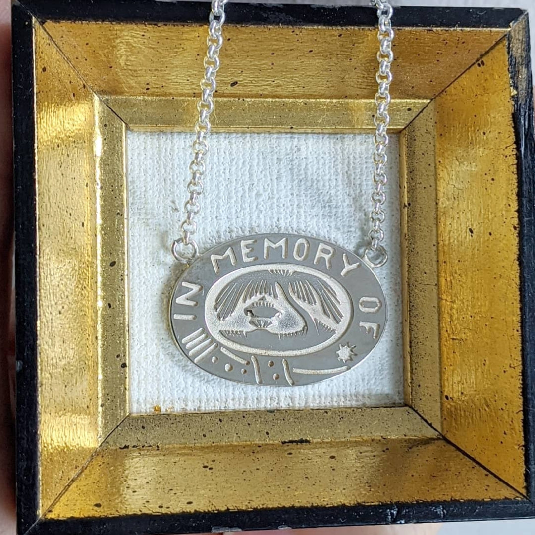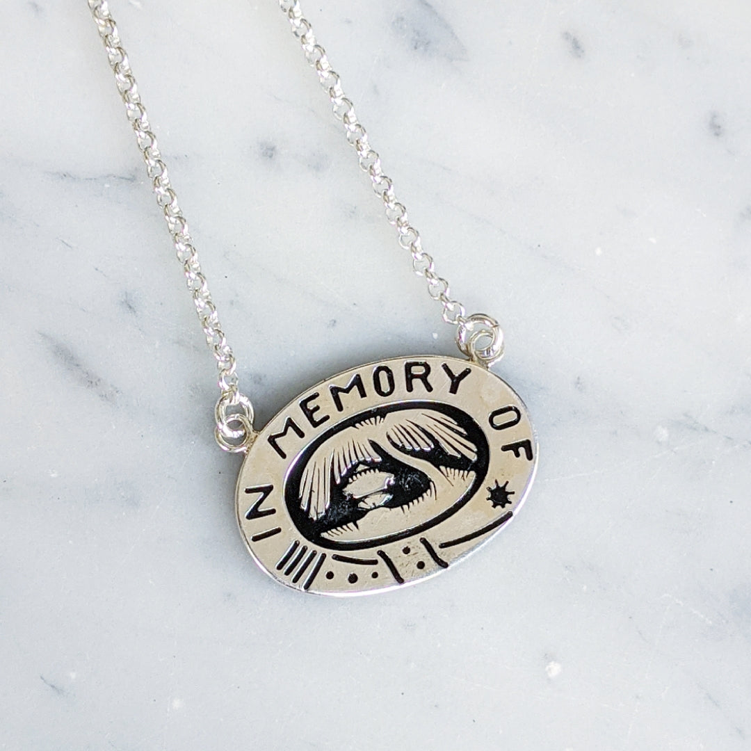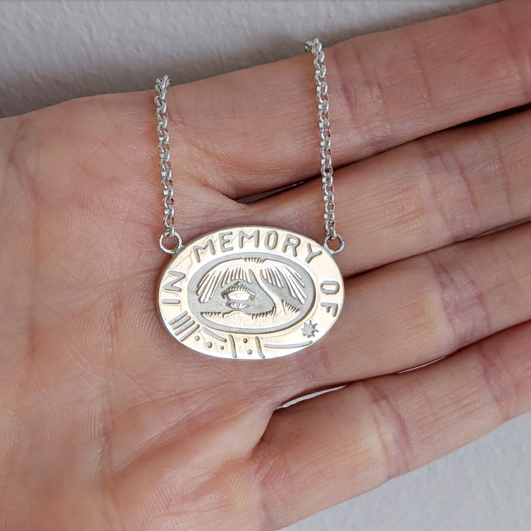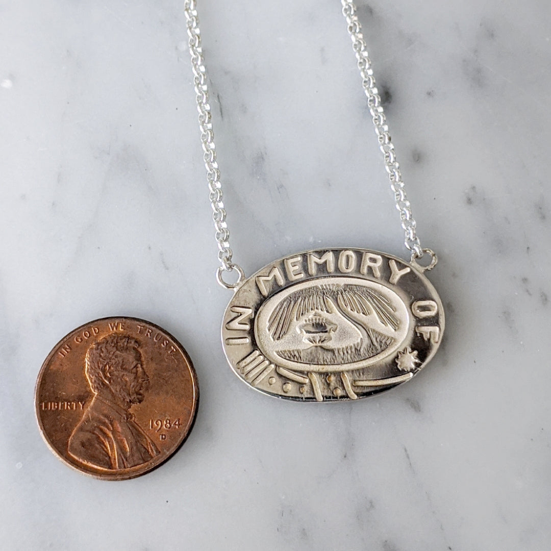 This gorgeous memento mori pendant that measures a little wider than 1" features an urn and tree and the words "In Memory Of" hanging from a rolo chain.