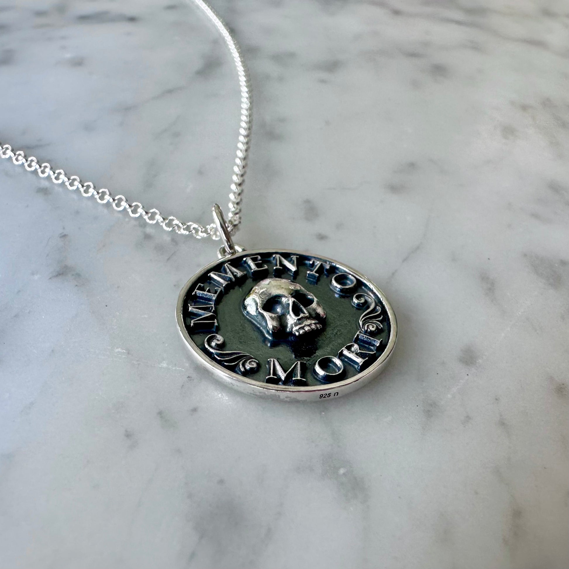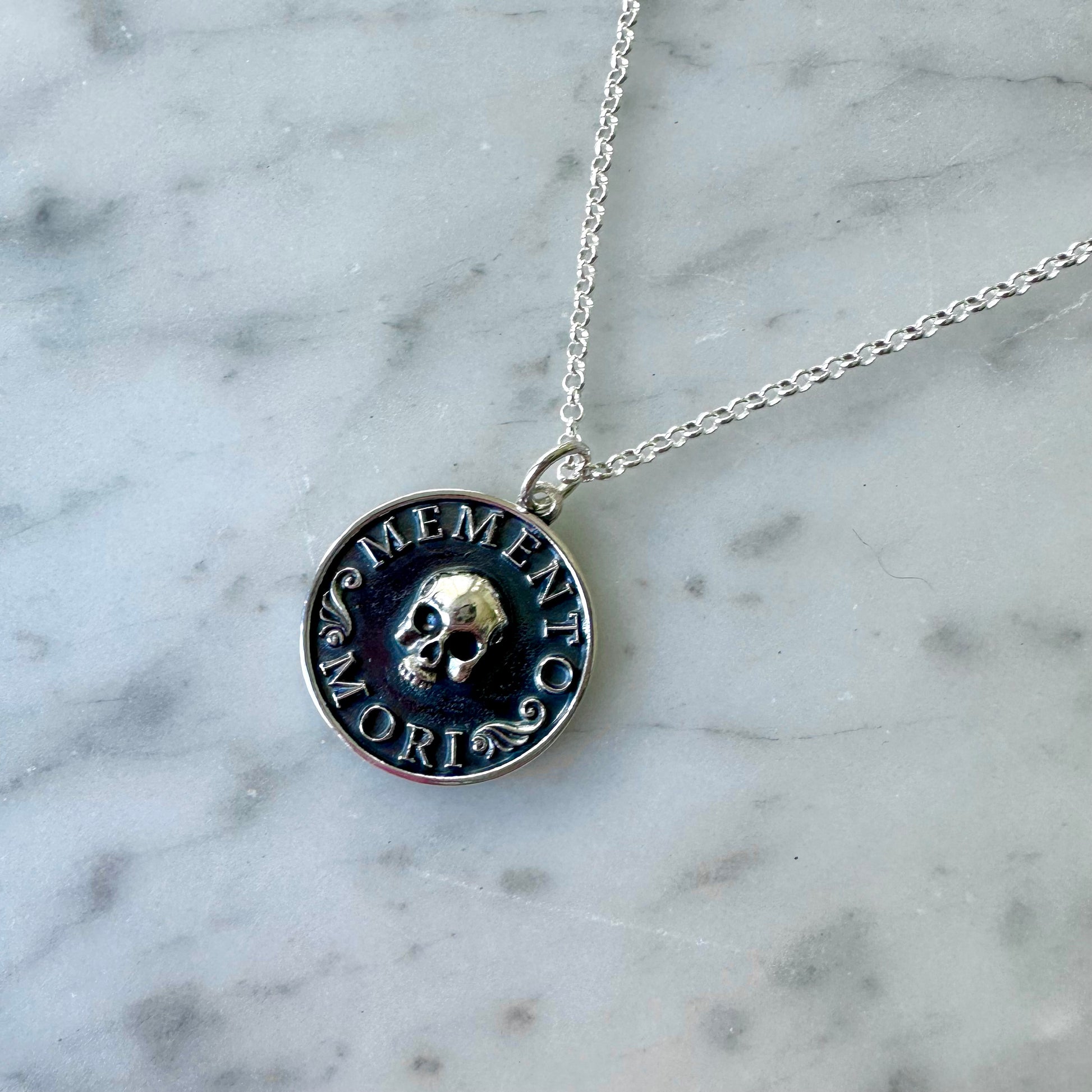 Antiqued sterling silver 25mm tall pendant featuring the words “Memento Mori” and a skull hanging from a sterling silver chain.