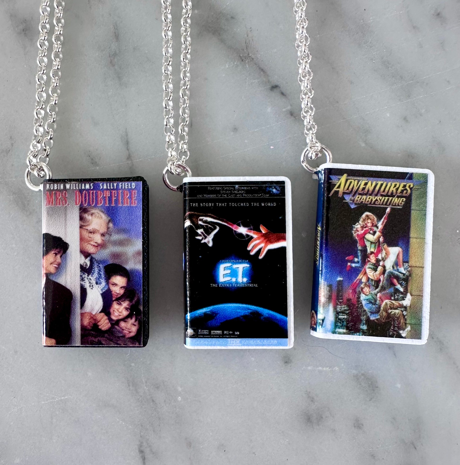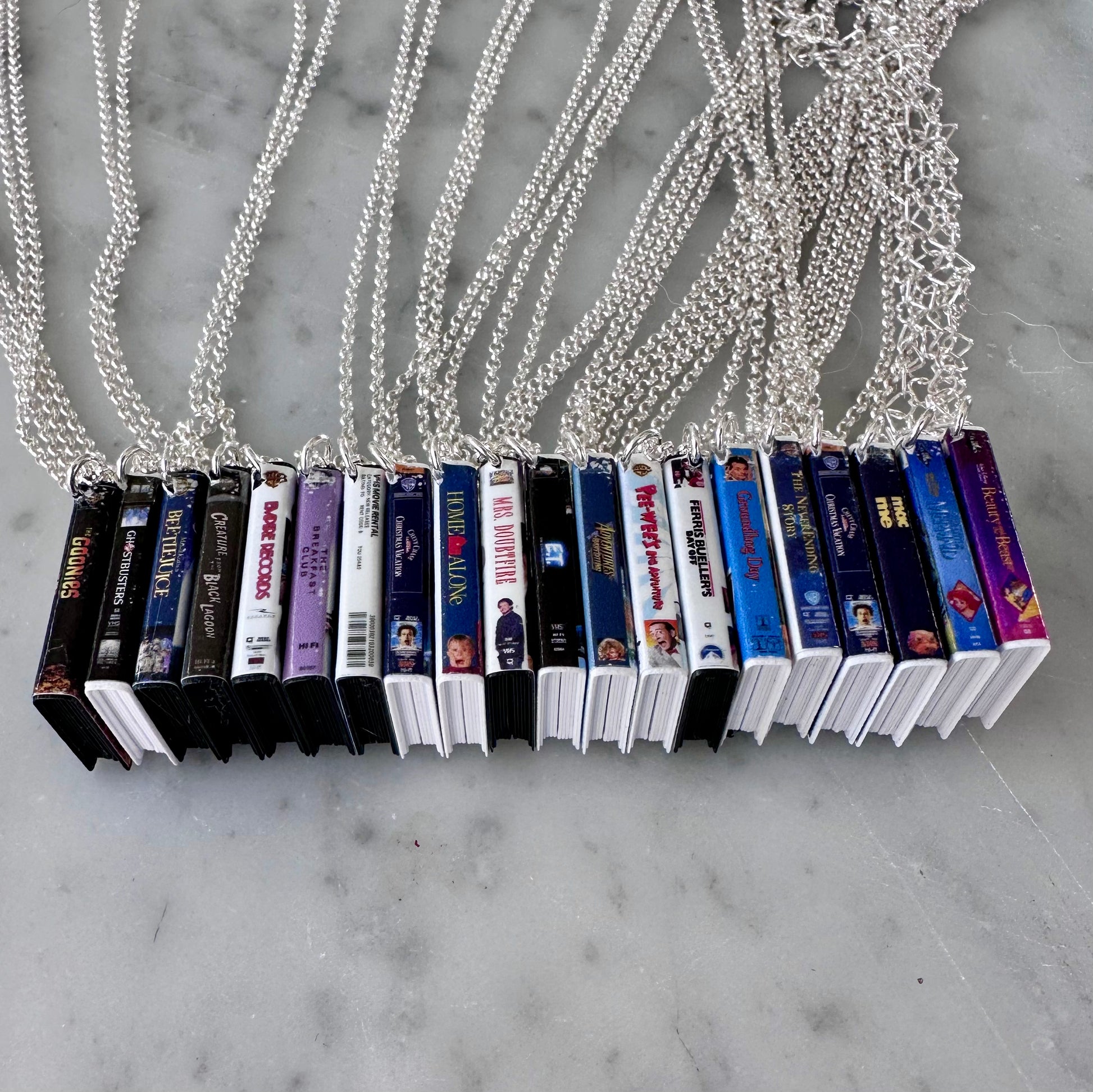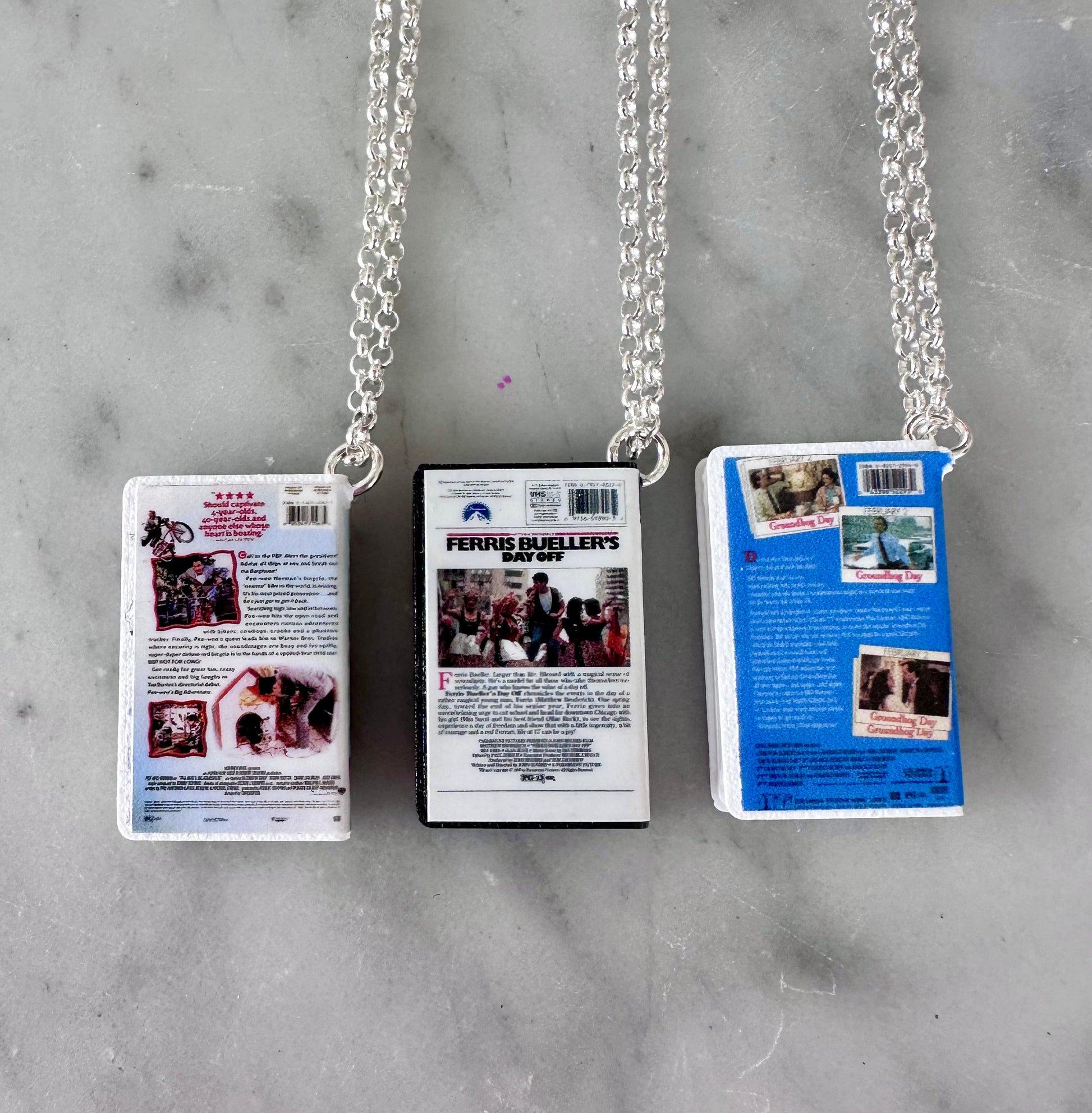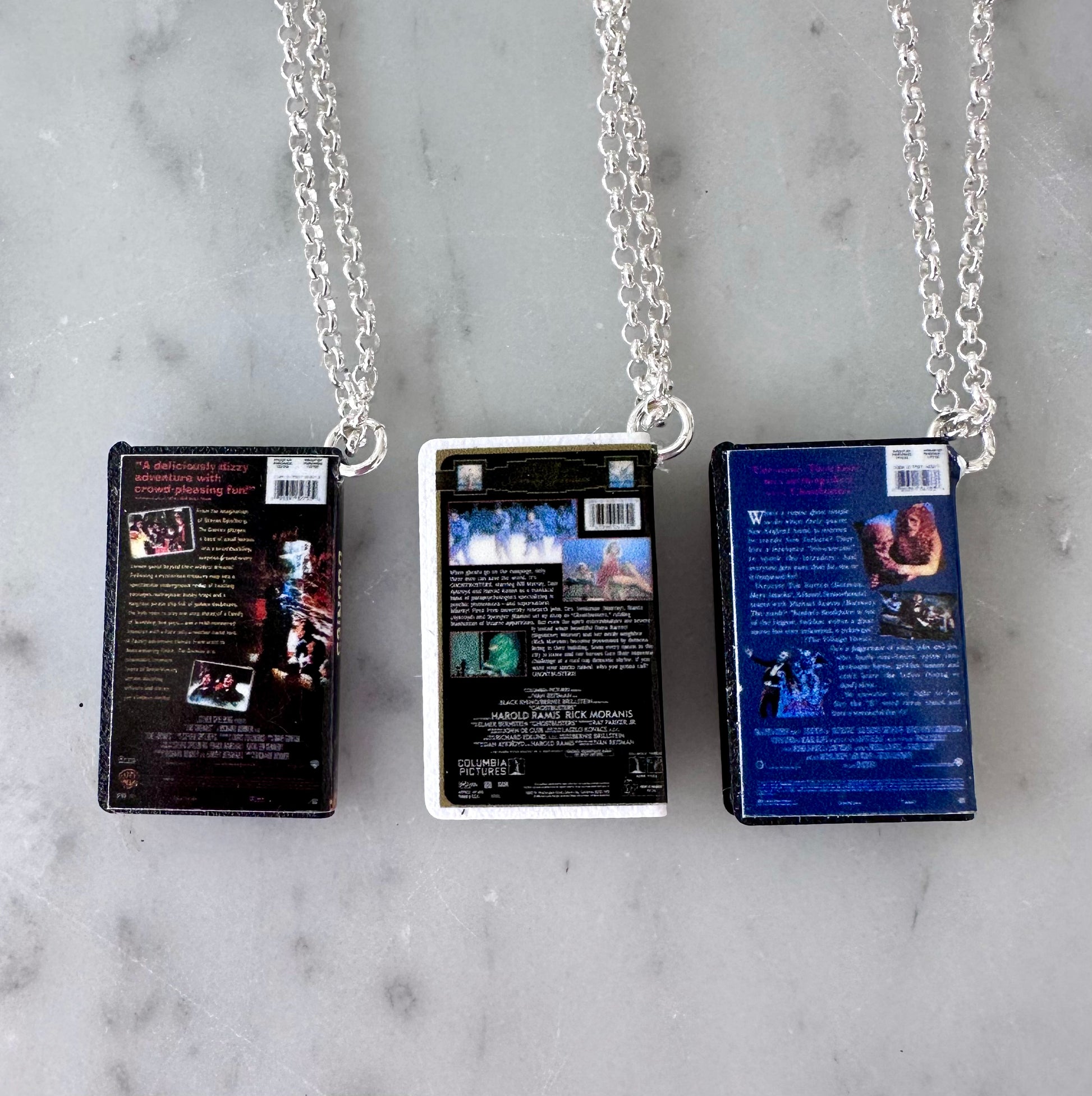 Miniature VHS tape with full original 360 detail! These are 1:12 of the size of a normal VHS tape. Each tape measures 2cm tall and hangs from a sterling silver chain.