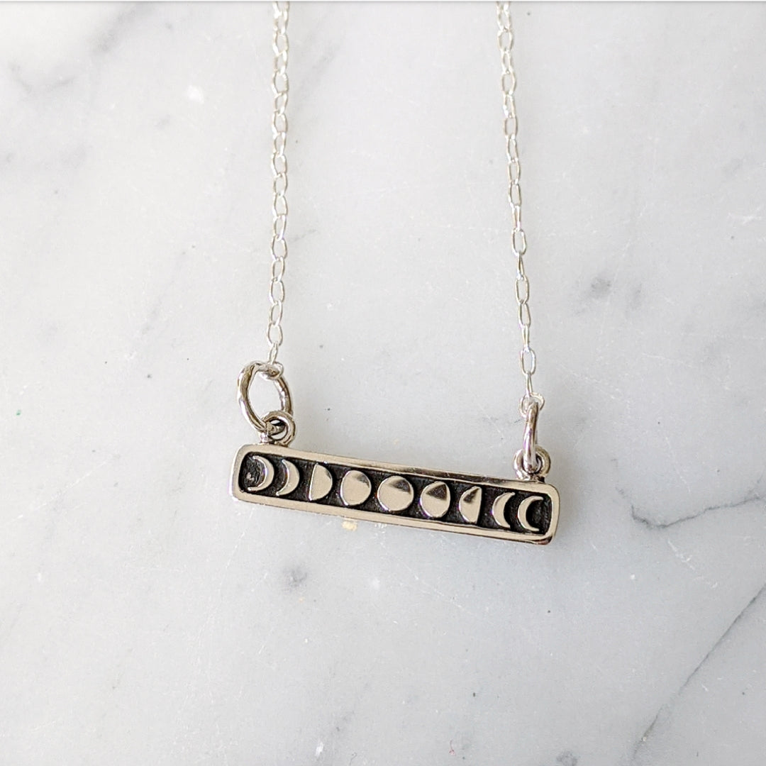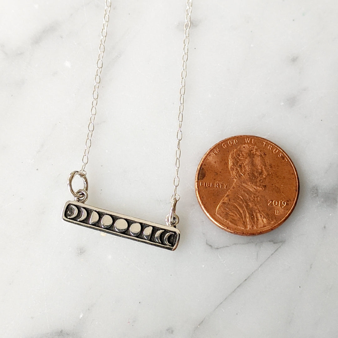Bronze bar pendant with moon phases on it hanging from a sterling silver chain.