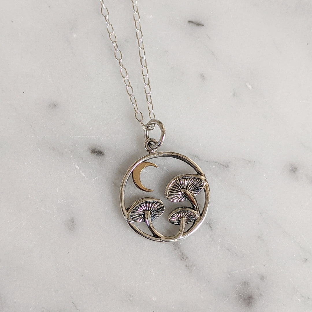 Gorgeous sterling silver mushroom pendant with bronze crescent moon hanging from a sterling silver chain.