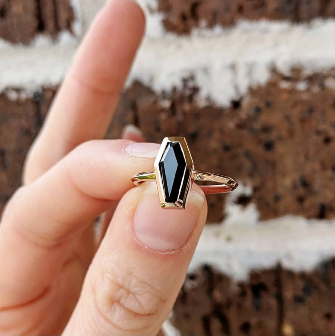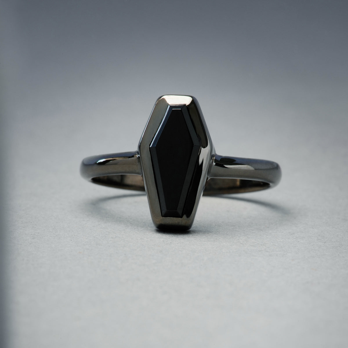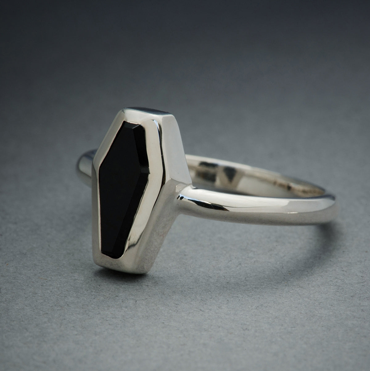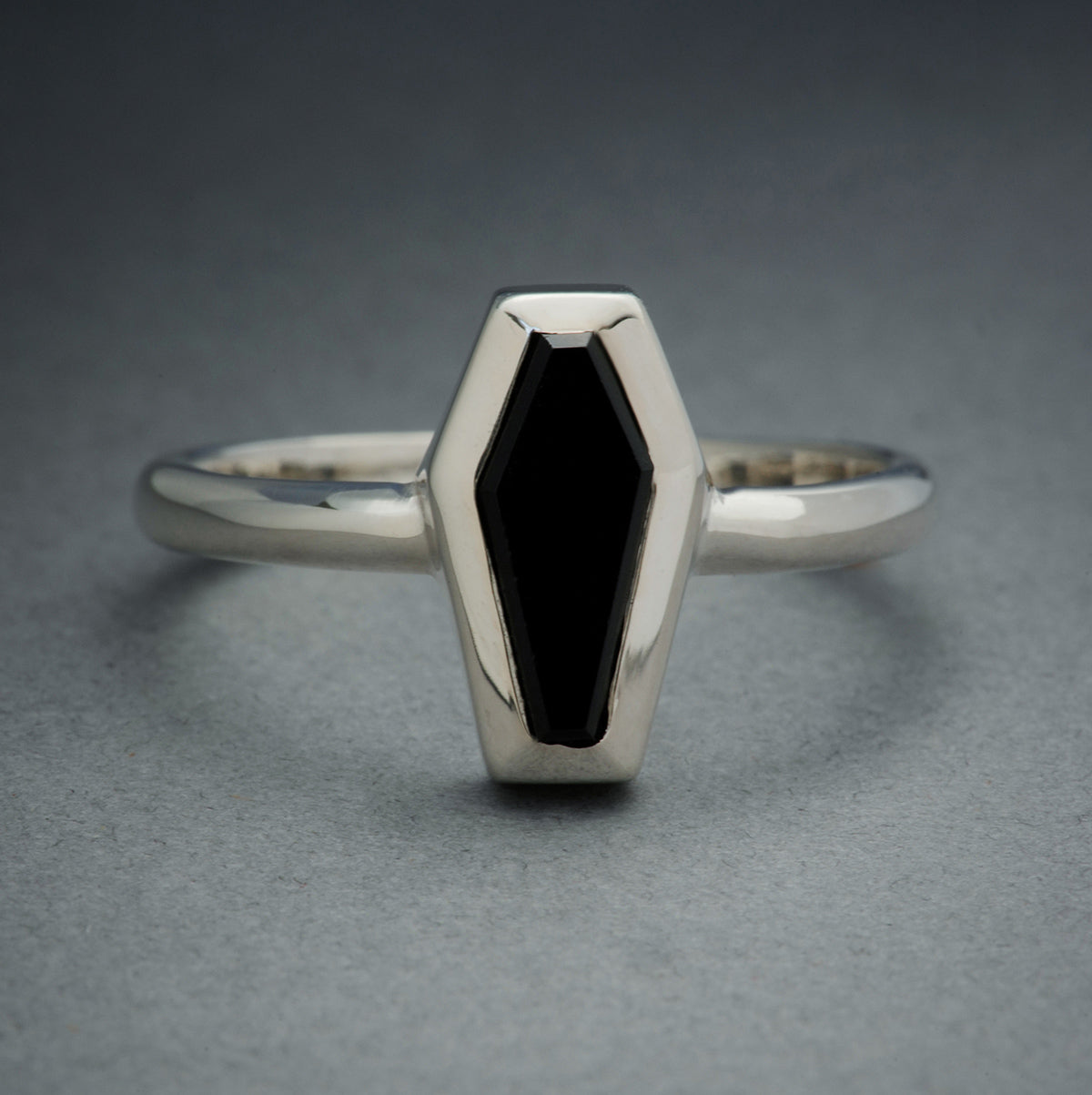 11mm tall coffin cut onyx in your choice of a 10k, 14k, or sterling silver setting.