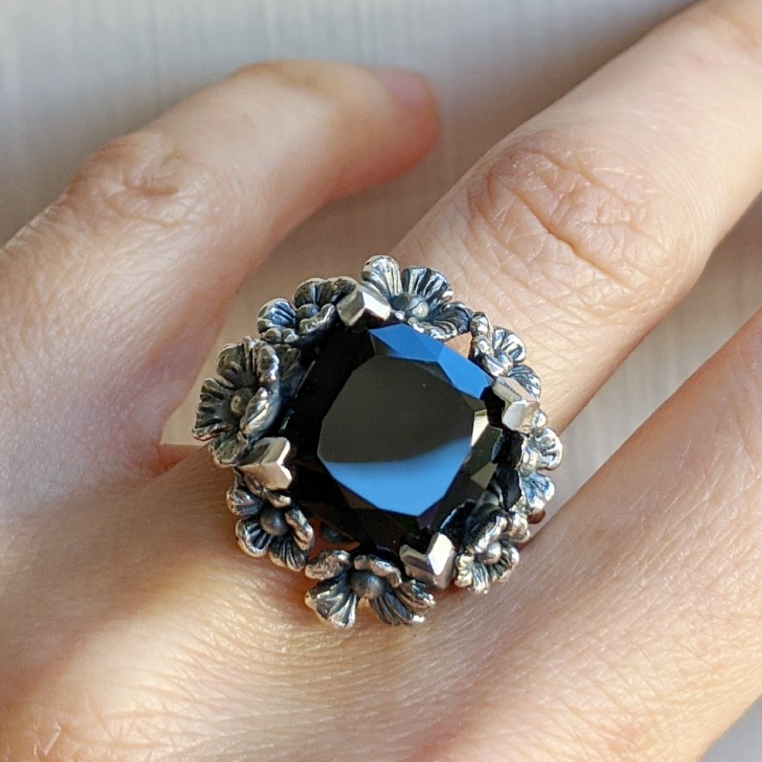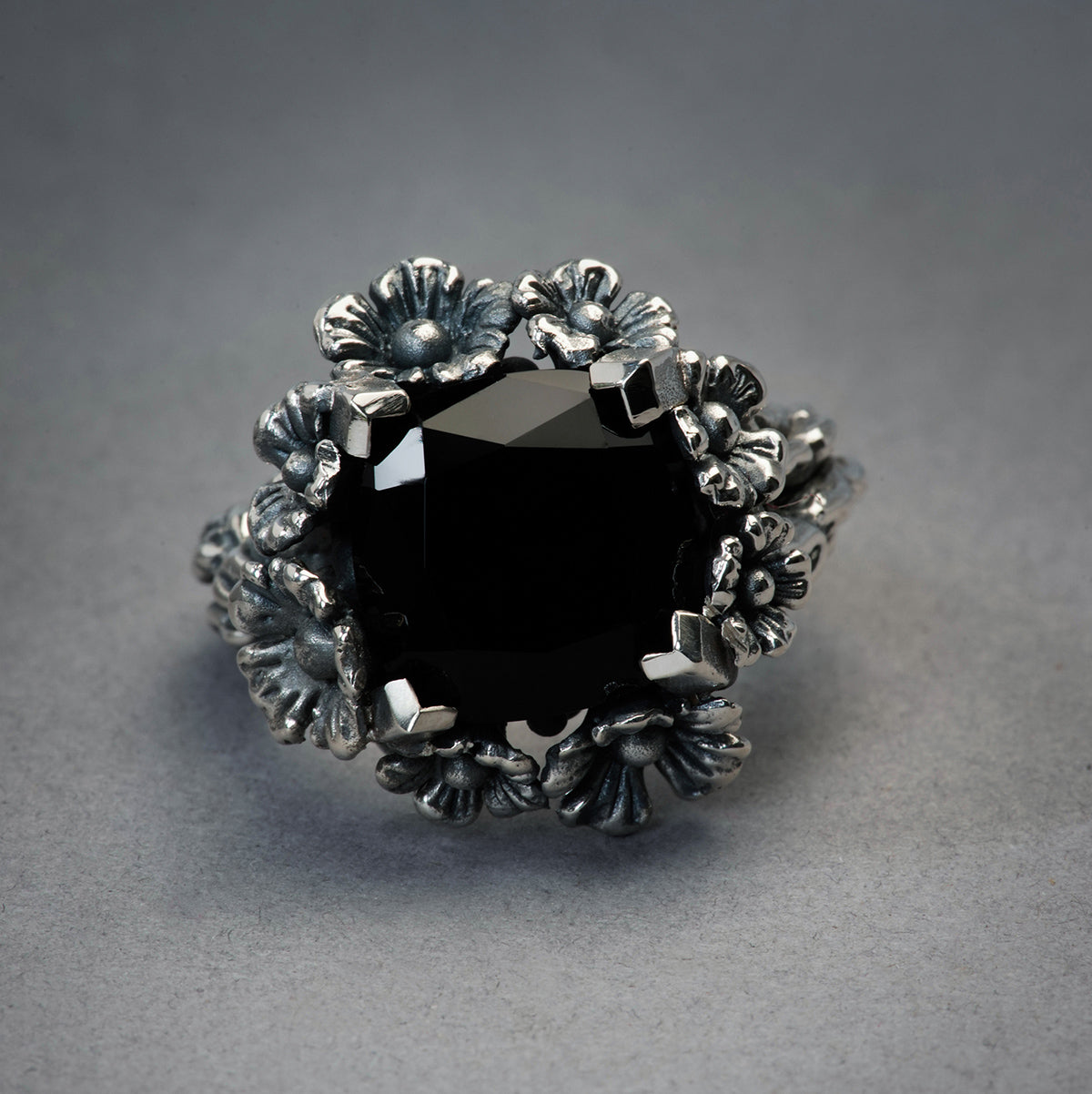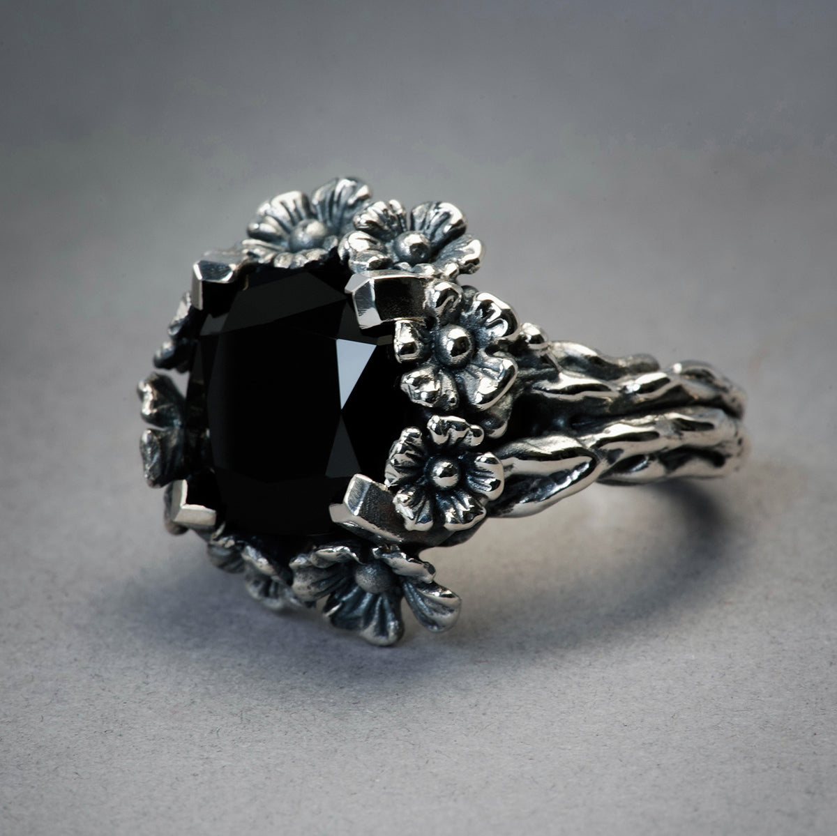 A stunning 12mm wide square top pyramid cut bottom onyx stone in a hand carved sterling forget me not setting.