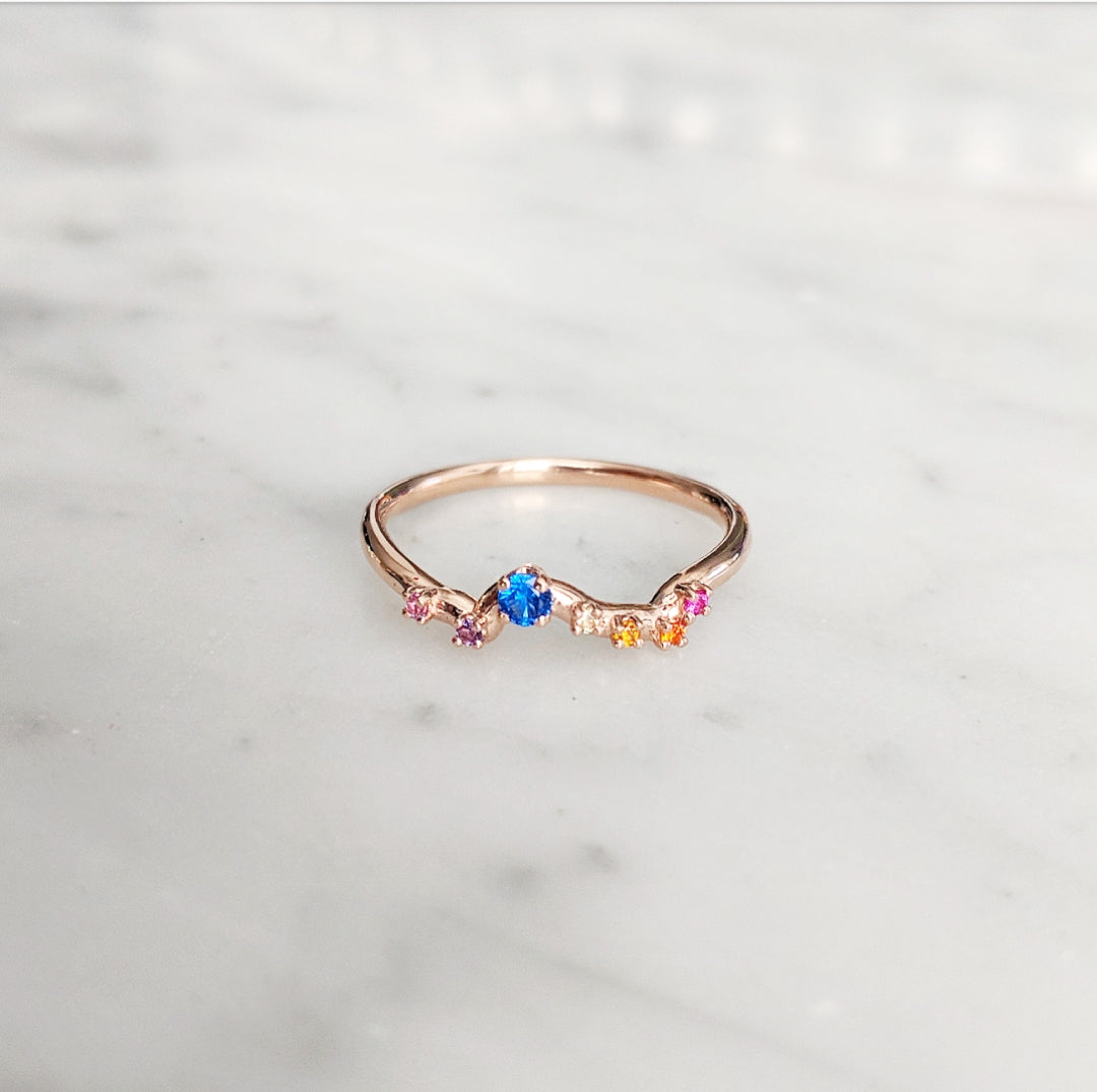 This gorgeous sparkly rose gold band is adorned with 1.25mm wide pink tourmaline, amethyst, peridot, yellow sapphire, citrine, and ruby and a 2.5mm wide blue sapphire.
