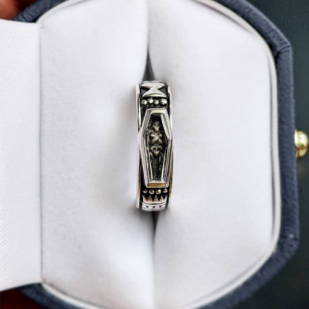 Extremely detailed band featuring two full skeletons, with a crown atop one's head signifying that "death is the ruler of all." Atop the other skeleton's head there is an hourglass, representing the fact that time is passing. All details on the ring are reserved on black enamel that encircles the outer ring loops. The focal point of this ring is the skeleton carved out of sterling silver that in encapsulated by a pristine faceted casket shaped crystal.