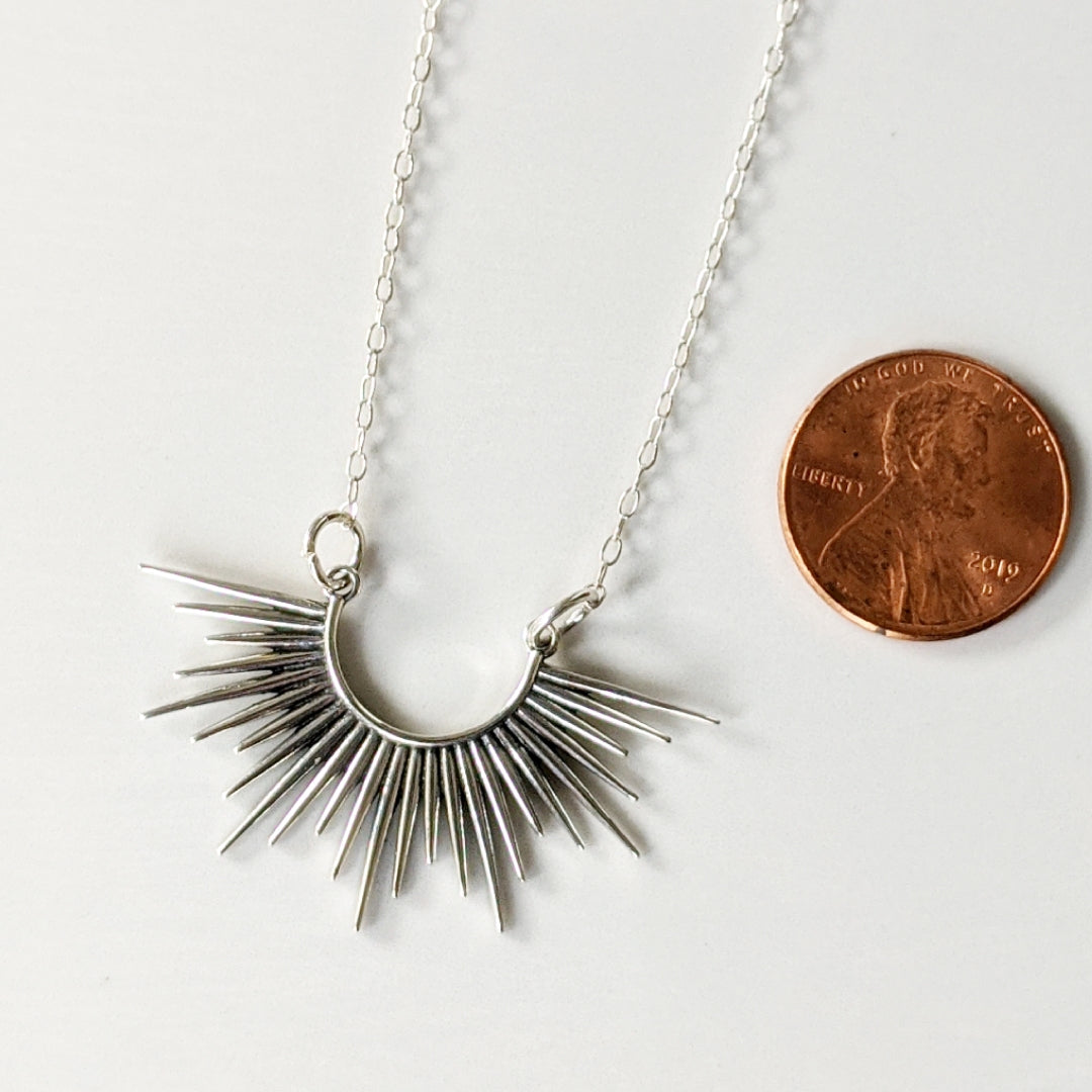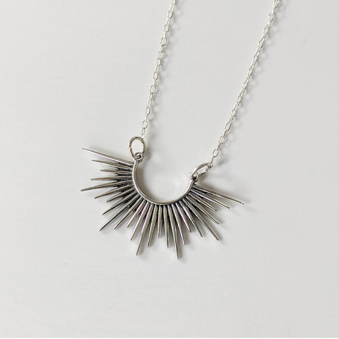 Beautiful sterling silver spiked burst pendant hanging from a sterling silver chain.