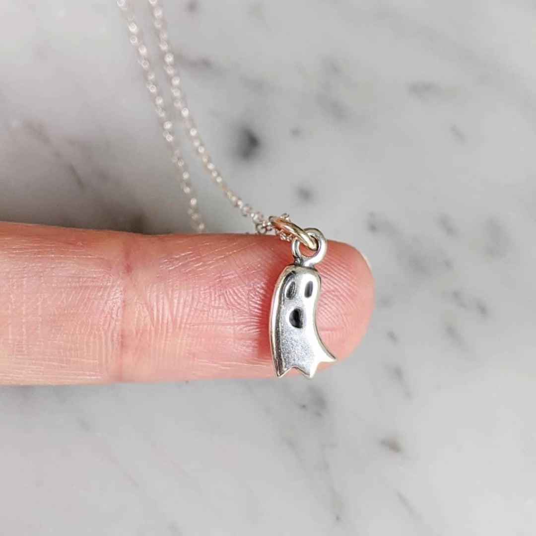 Sterling silver 10mm tall ghost charm hanging from a 17" sterling silver chain.