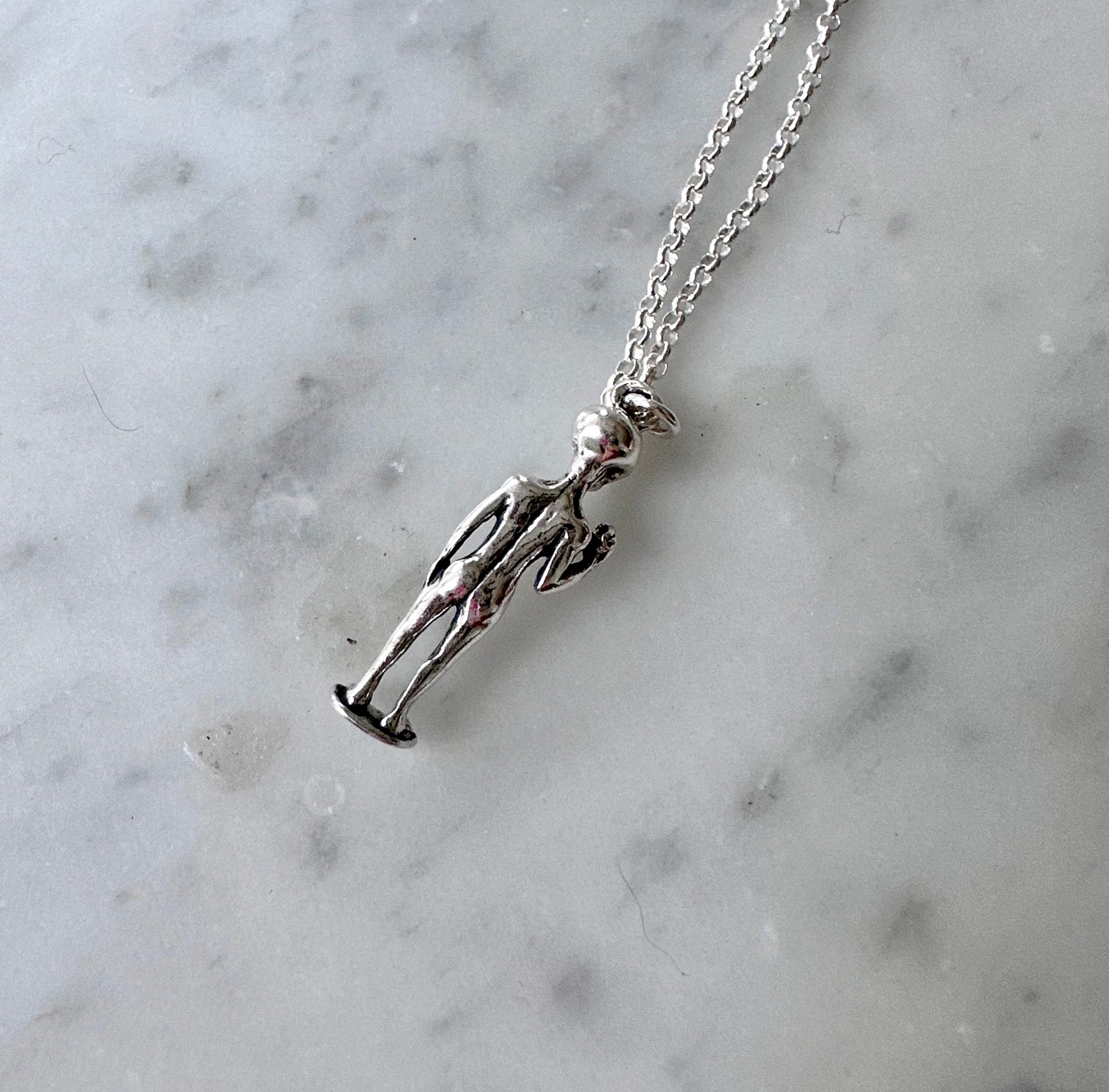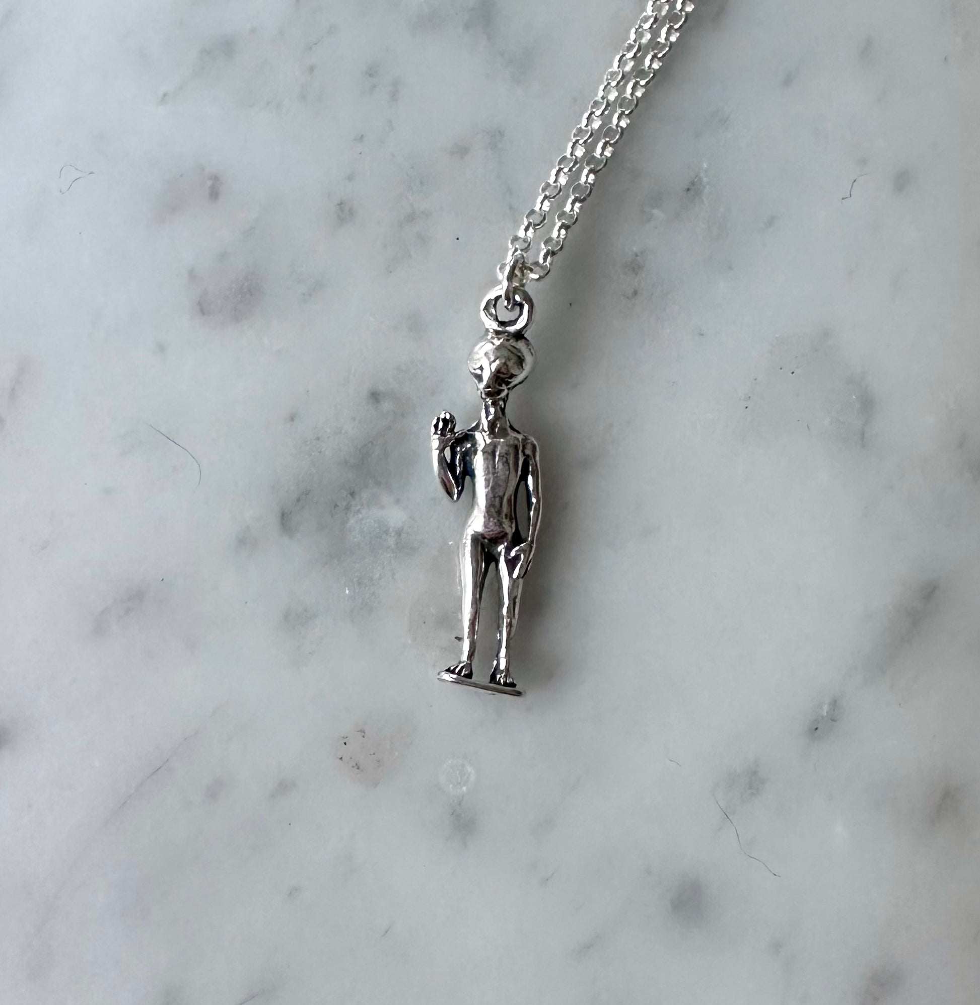 1” tall sterling silver alien charm hanging from a sterling silver chain.