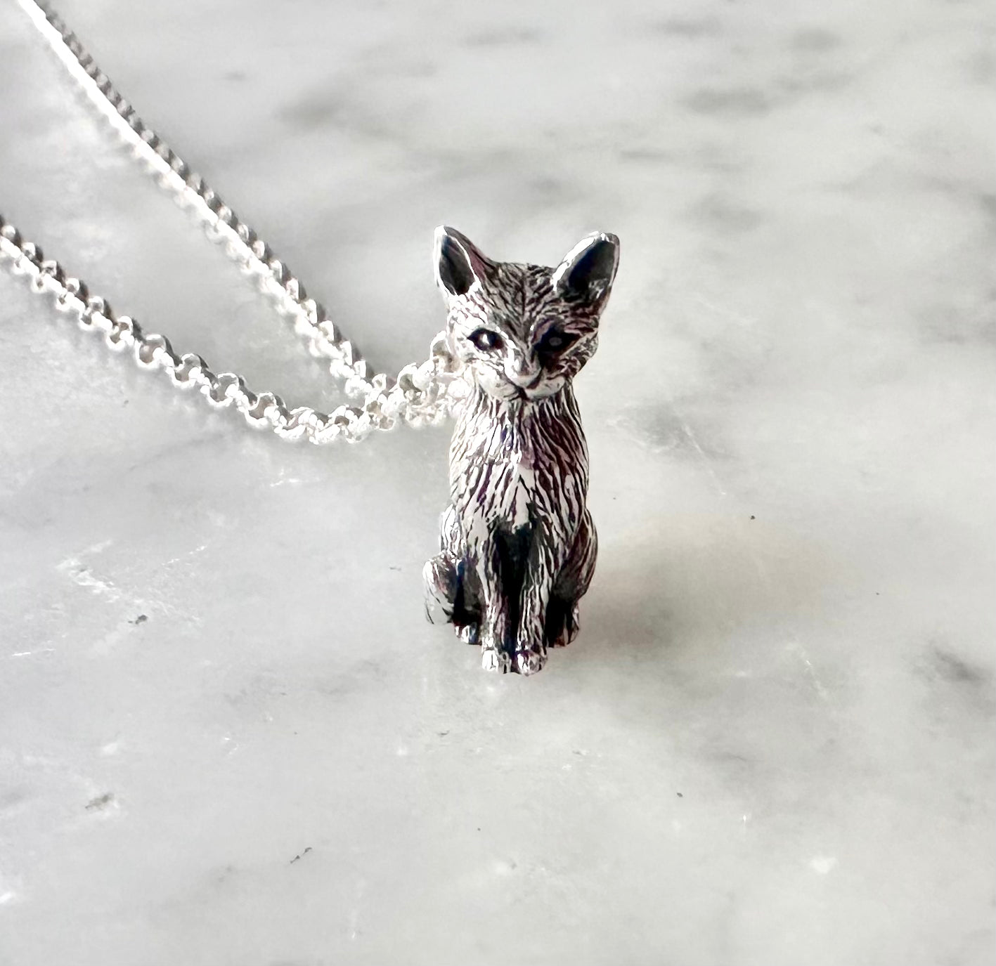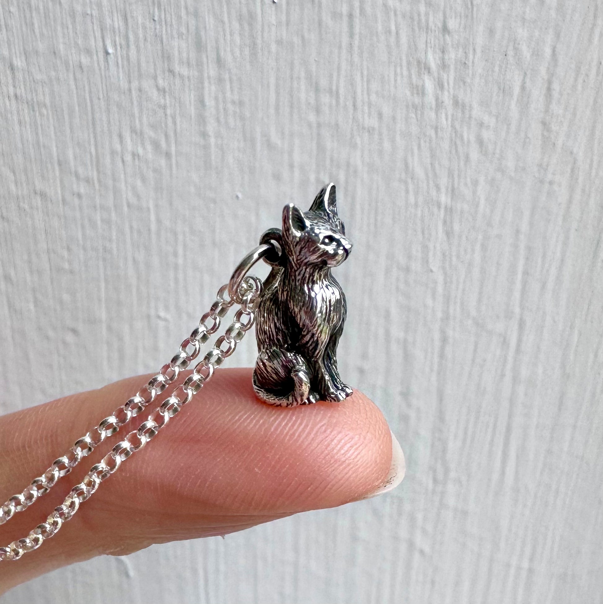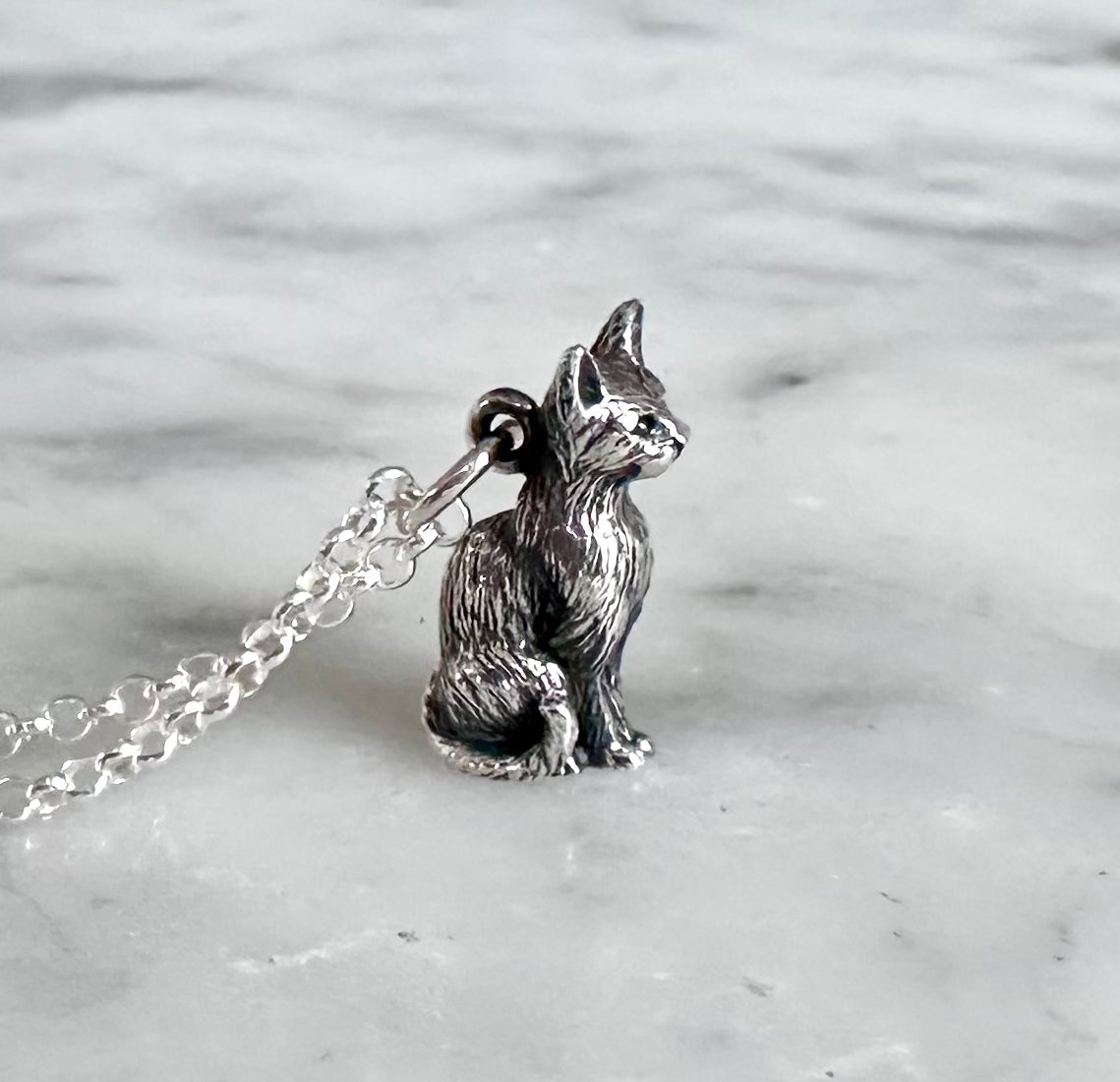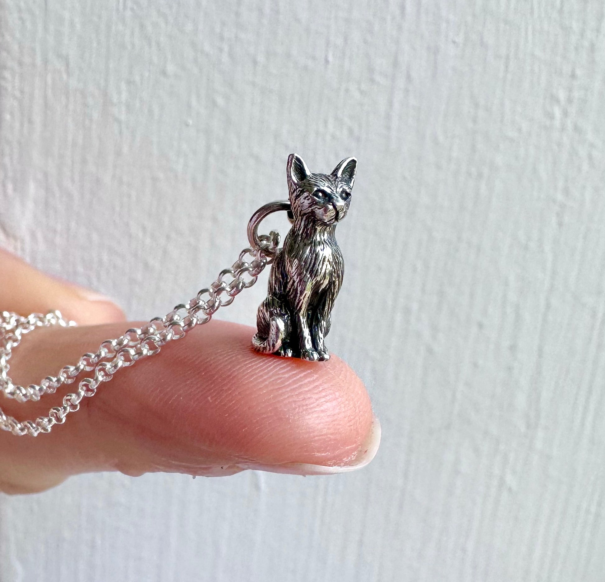 Tiny detailed sterling silver kitty charm hanging from a sterling silver chain.