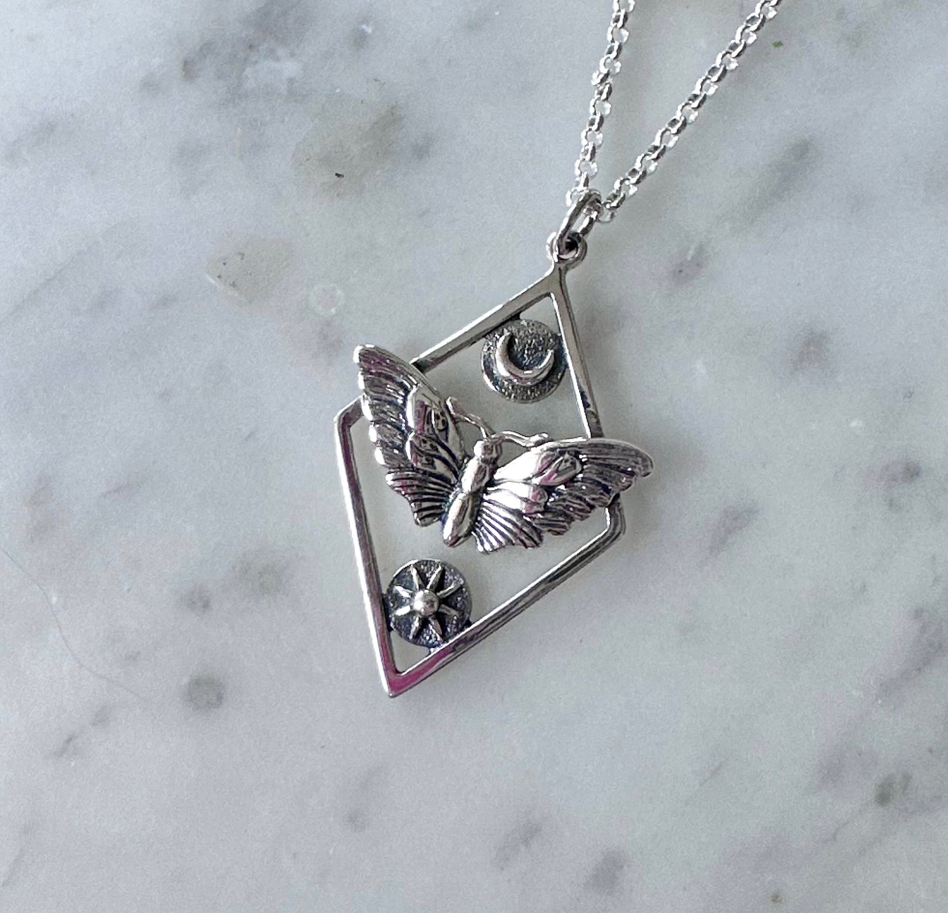 35mm tall sterling silver geometric sun and moon moth pendant hanging from a sterling silver chain.
