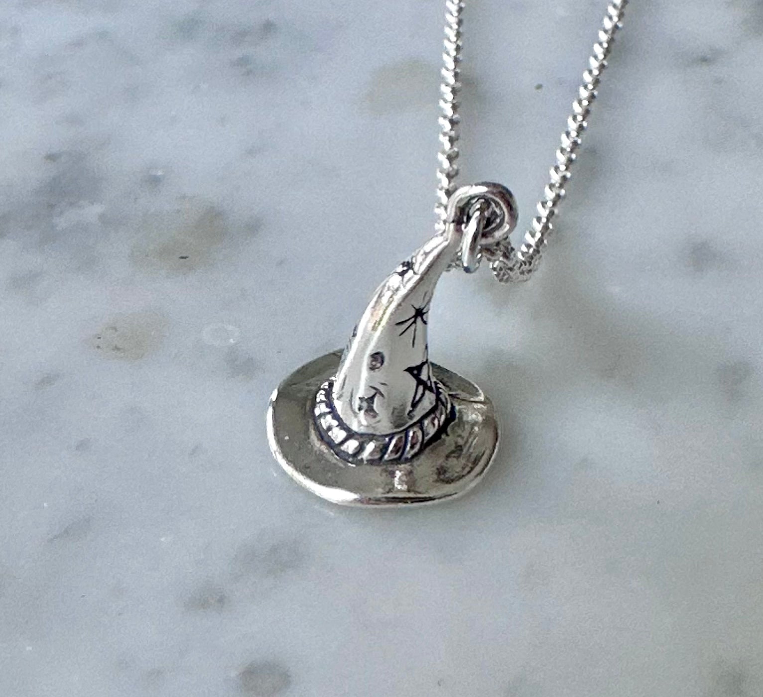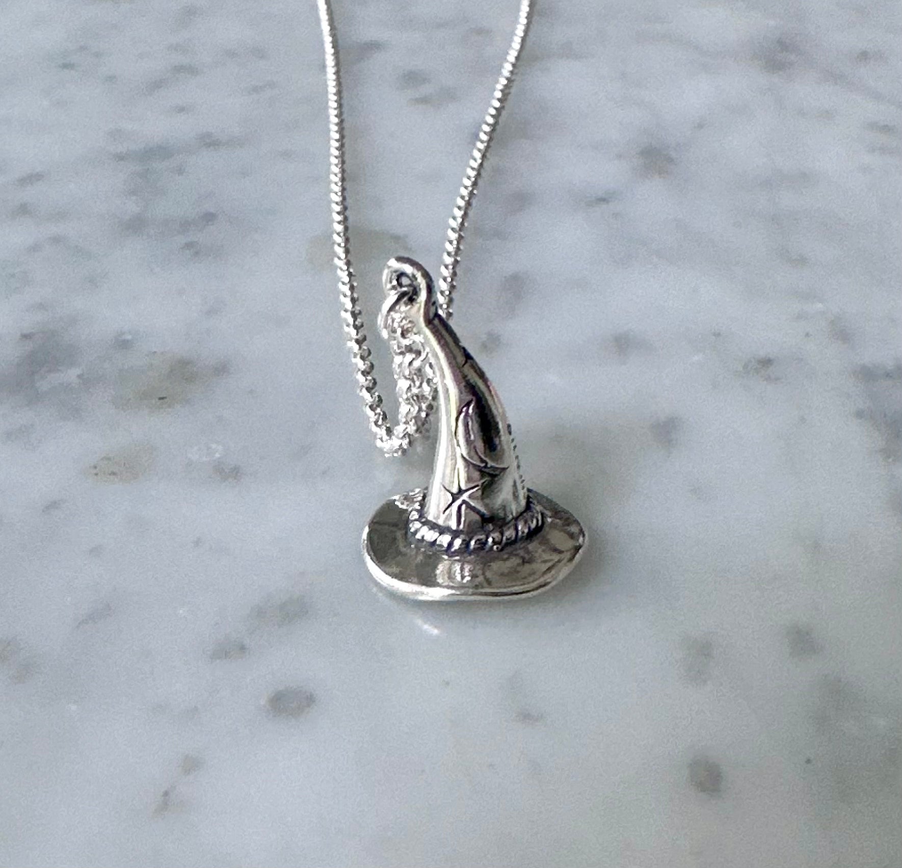 3/4” tall sterling silver wizard hat hanging from a sterling silver chain.