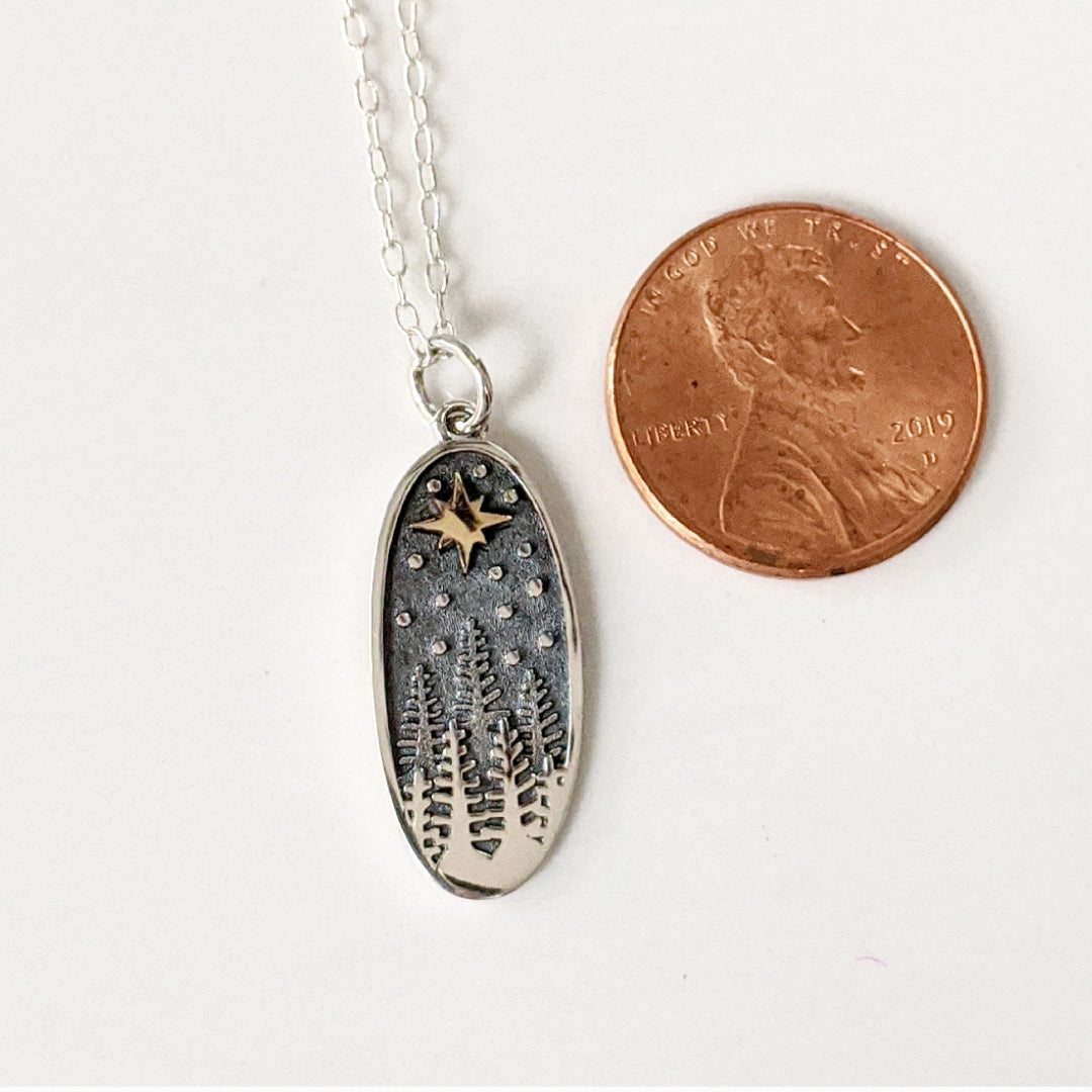 Sterling silver pendant with beautiful trees and a bronze star hanging from a sterling silver chain.