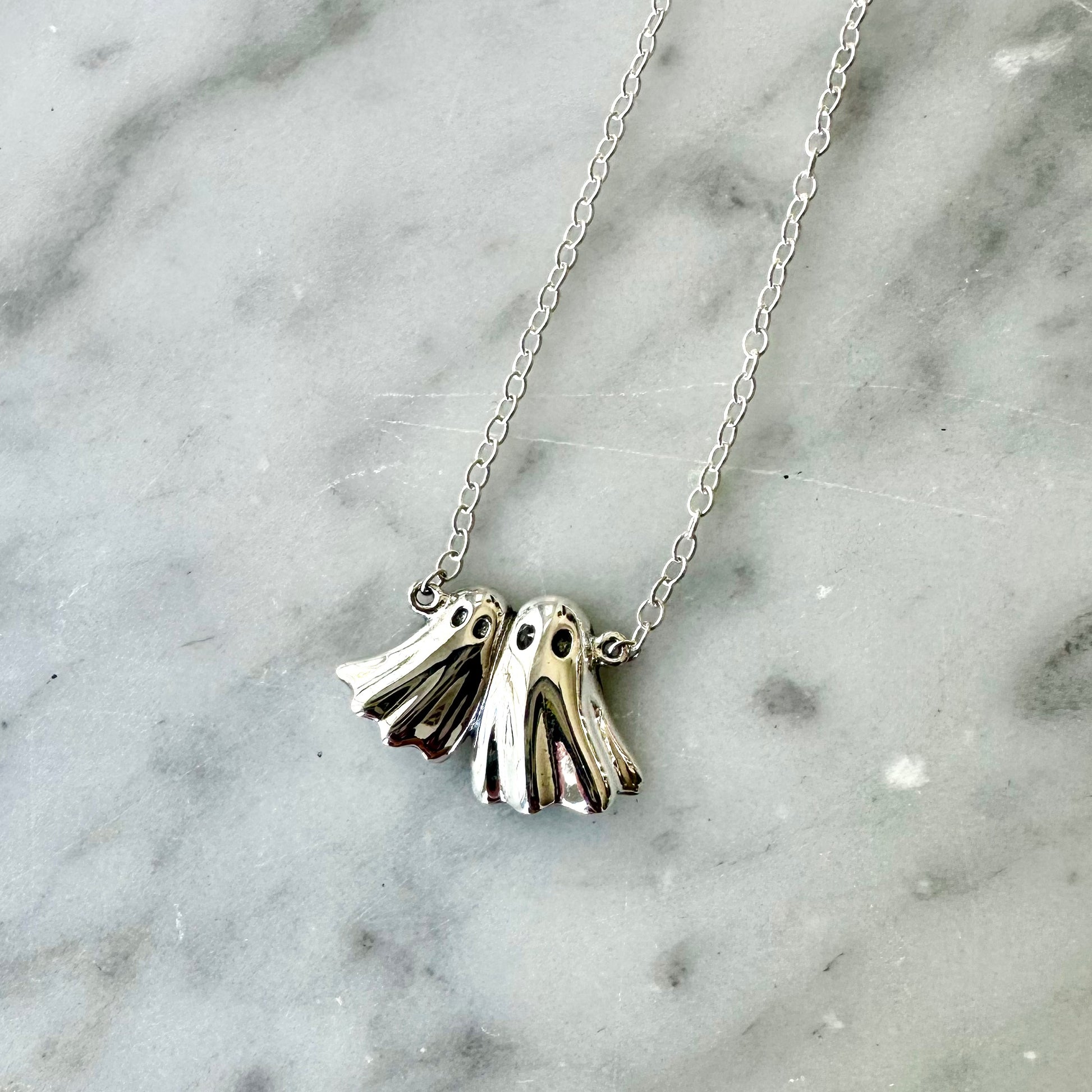 A highly detailed sterling silver pair of ghosts hanging form a sterling silver chain.